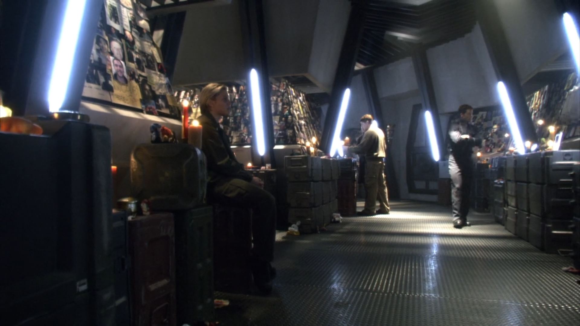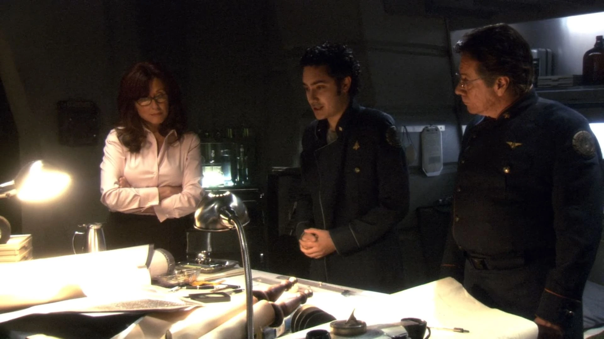 | is interrogated aboard Galactica, while a makeshift bar called "Joe's" in the hangar deck becomes popular and the relationship problems of Apollo, Dualla, Starbuck and Anders unfold.