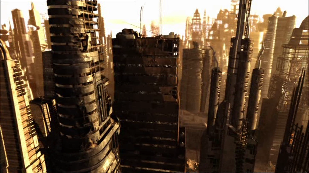 During the Fall of the Twelve Colonies, Delphi suffered considerable damage to its skyscrapers, with many left as exposed hulks. That they survived at all suggests the city was attacked by Raider sorties and the Centurion landing forces rather than subjected to nuclear bombardment as Caprica City was.