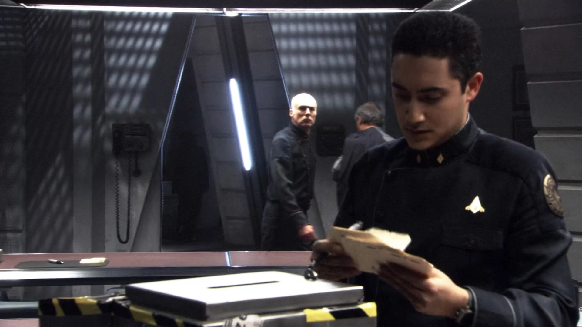 Starbuck and Anders get reacquainted in a bunk room. Commander Apollo enters to introduce himself to Anders, but a drunken Starbuck barely acknowledges Apollo's presence and makes crude remarks about his new relationship with Petty Officer Dualla.