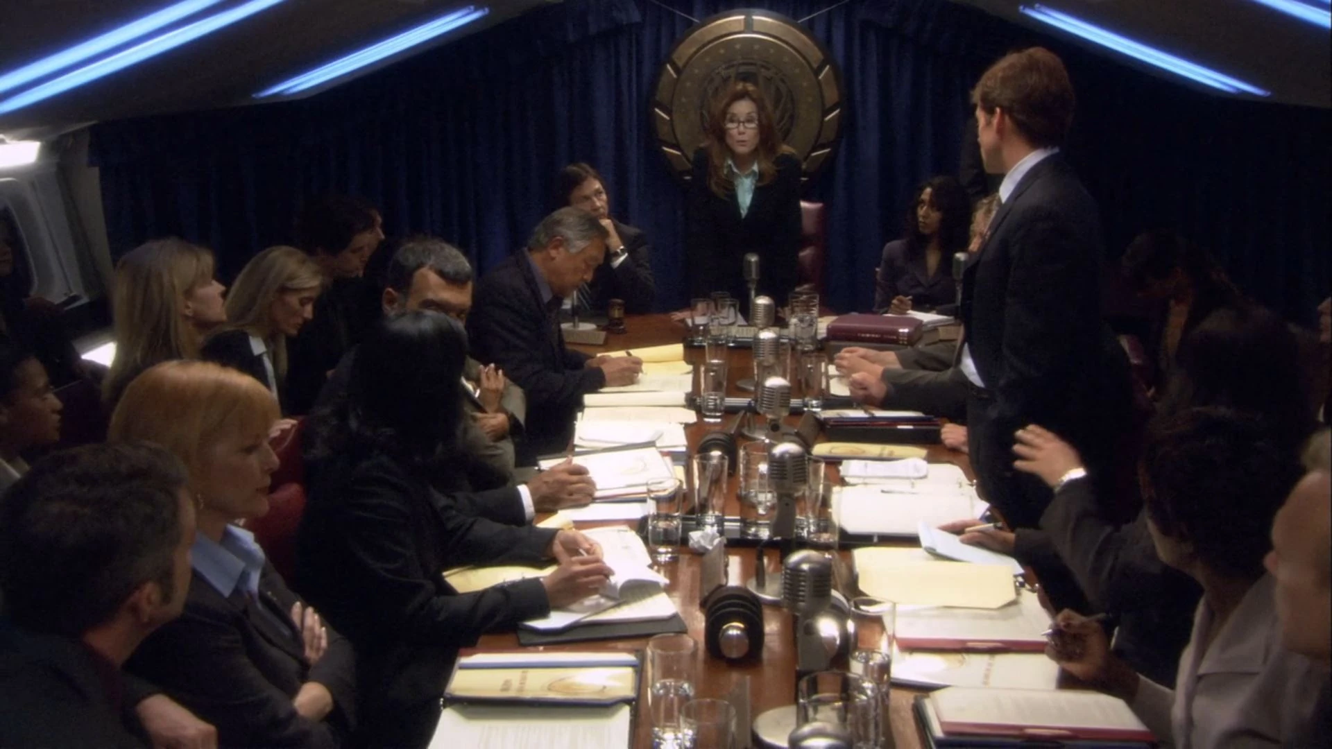 In the ragtag fleet, Lee Adama becomes the Caprican delegate for the Quorum of Twelve, though the media's real attention is on the missing Demetrius, and its "classified military assignment". Lee is then paid a visit by Tom Zarek, who tells him that Roslin and Adama have continued to suppress information and believes the Demetrius affair will create more tension if Roslin doesn't come clean about its mission. He ends saying that he hopes, as a Quorum member, Lee will not ignore the truth, which he doesn't as he brings up another issue; Executive Order 112, which deals with the method by which the President establishes a tribunal and he believes it gives the President too much power. Roslin responds that she intended to discuss the order at the next Quorum meeting.