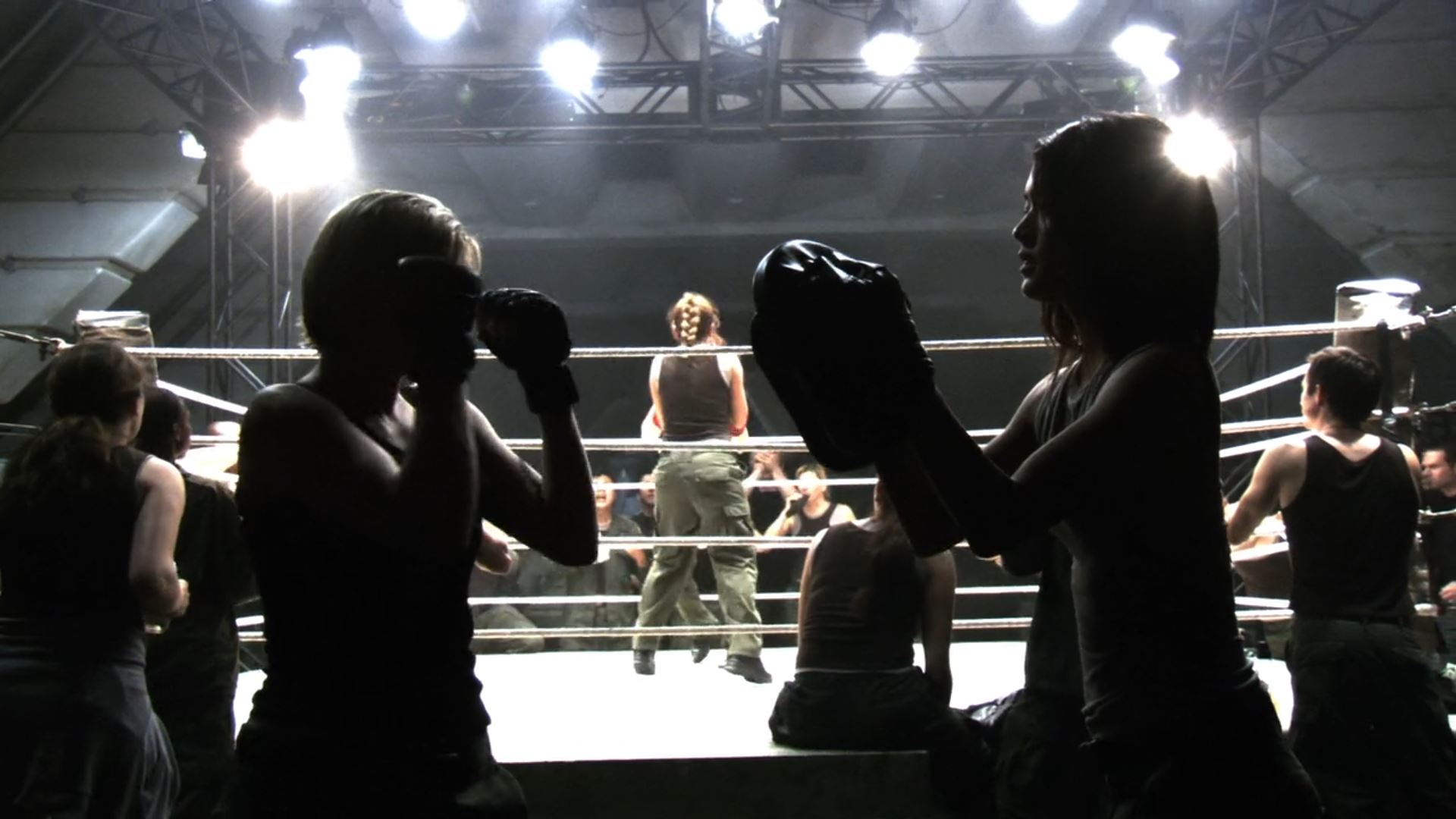 Admiral Adama arrives with President Roslin, who is a boxing enthusiast, to watch the next series of fights; Kat wins against a female crew member, and Hot Dog is quickly knocked out by Starbuck.